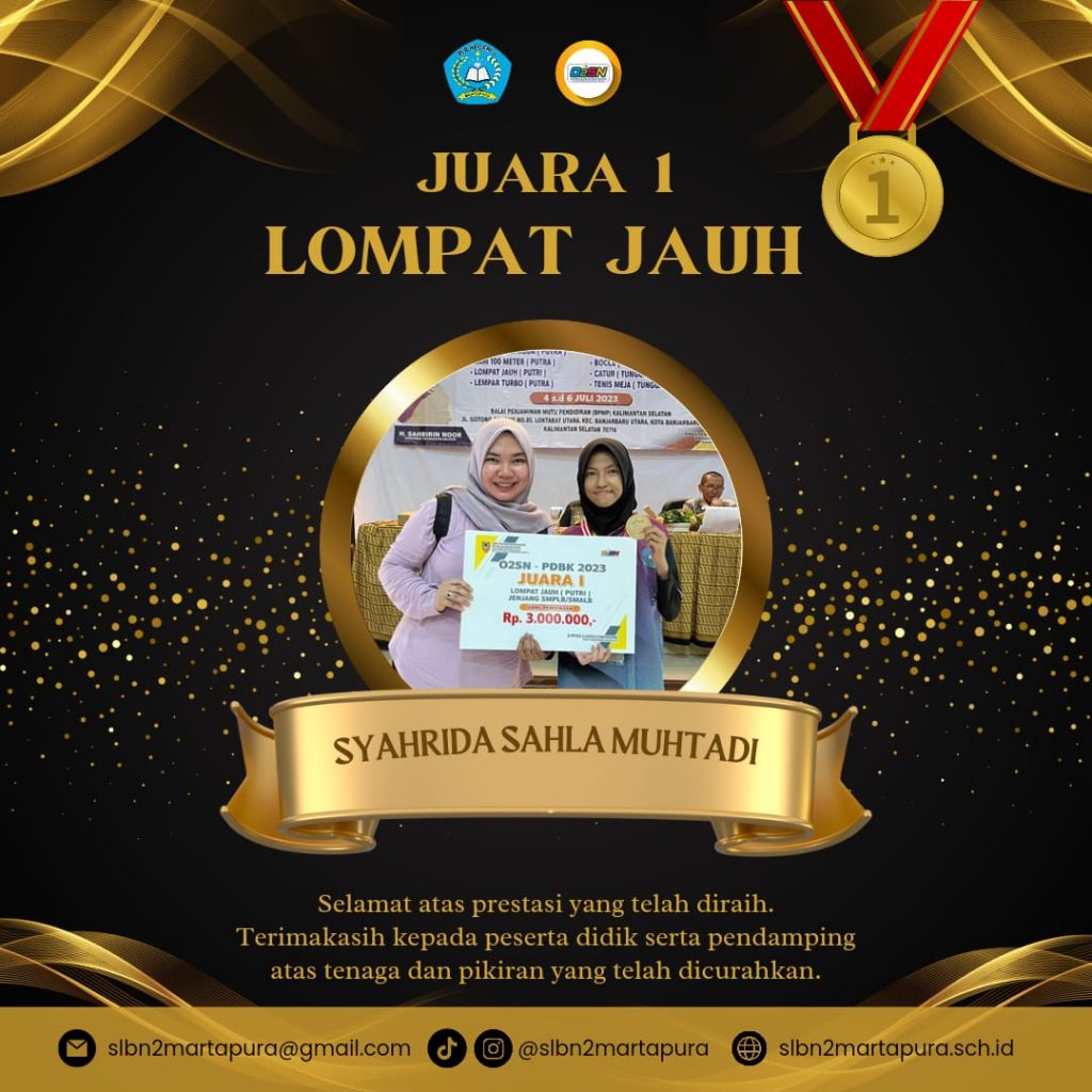 SLBN 2 Martapura kembali mengikuti ajang olahraga bergengsi tahunan O2SN (Olimpiade Olahraga Siswa Nasional) yang rutin diadakan oleh Dinas Pendidikan dan Kebudayaan Prov. Kalimantan Selatan. Kegiatan ini berlangsung pada tanggal 04-06 Juli 2023 di Banjarbaru. Pada kesempatan kali ini, tim O2SN SLBN 2 Martapura mengikuti 6 cabang olahraga diantaranya, lari 100 meter, lompat jauh, lempar turbo, bulu tangkis, bocce, dan tenis meja.