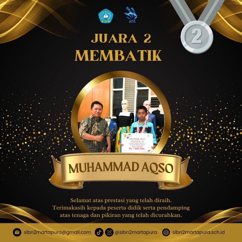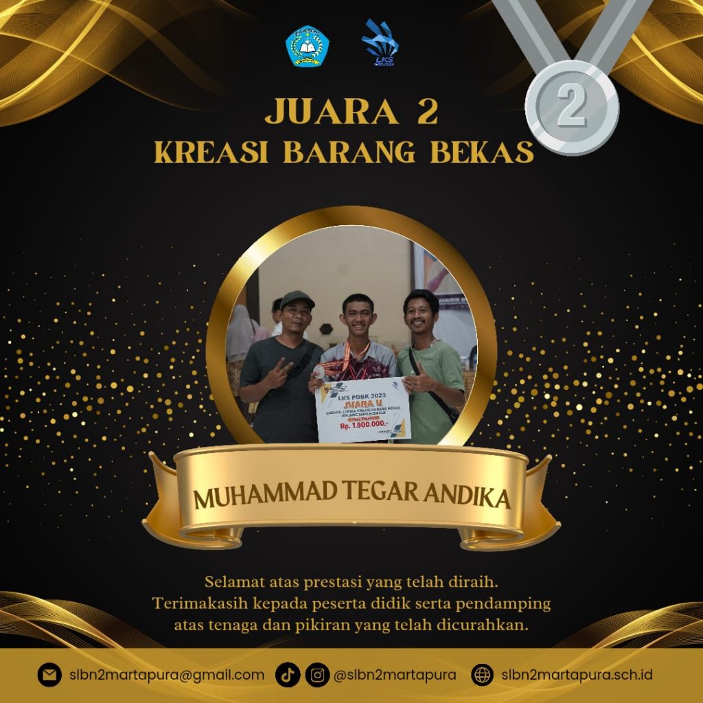 Di penghujung kegiatan, SLB Negeri 2 Martapura berhasil menghantarkan 4 peserta didiknya meraih juara yakni; Juara 2 Lomba Membatik atas nama Muhammad Aqso, Juara 2 Lomba Kreasi Barang Bekas atas nama Muhammad Tegar Andika, dan Juara 2 Lomba Tata Boga atas nama Muhammad Faisal, serta Juara 1 Lomba Kecantikan atas nama Muhibbah yang nantinya akan turut serta mewakili Kalimantan Selatan di ajang LKSN PDBK 2023 di tingkat Nasional.